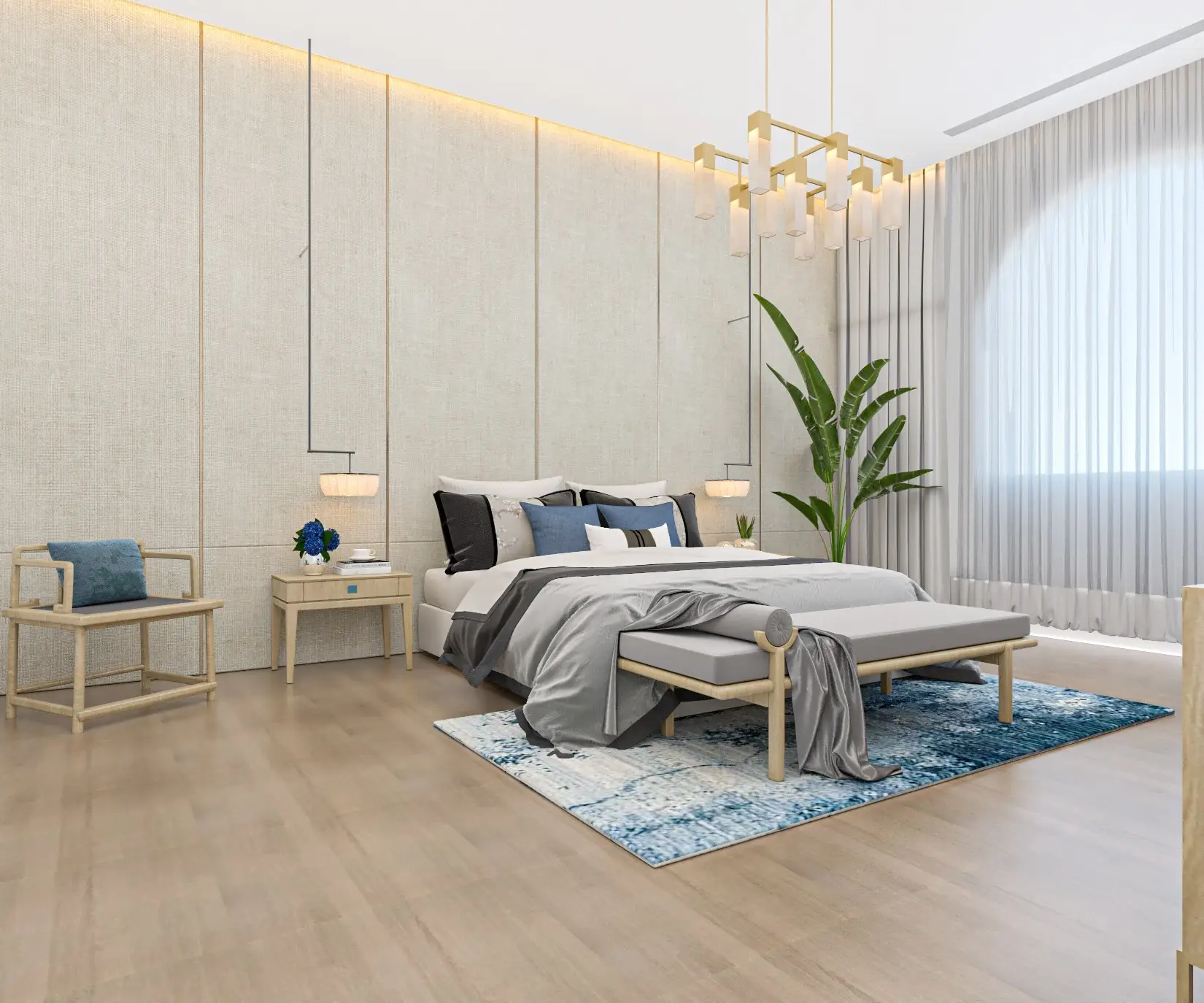 The design showcases the carefully selecting and arranging furniture, lighting distribution, and aesthetic finishes added to the space.