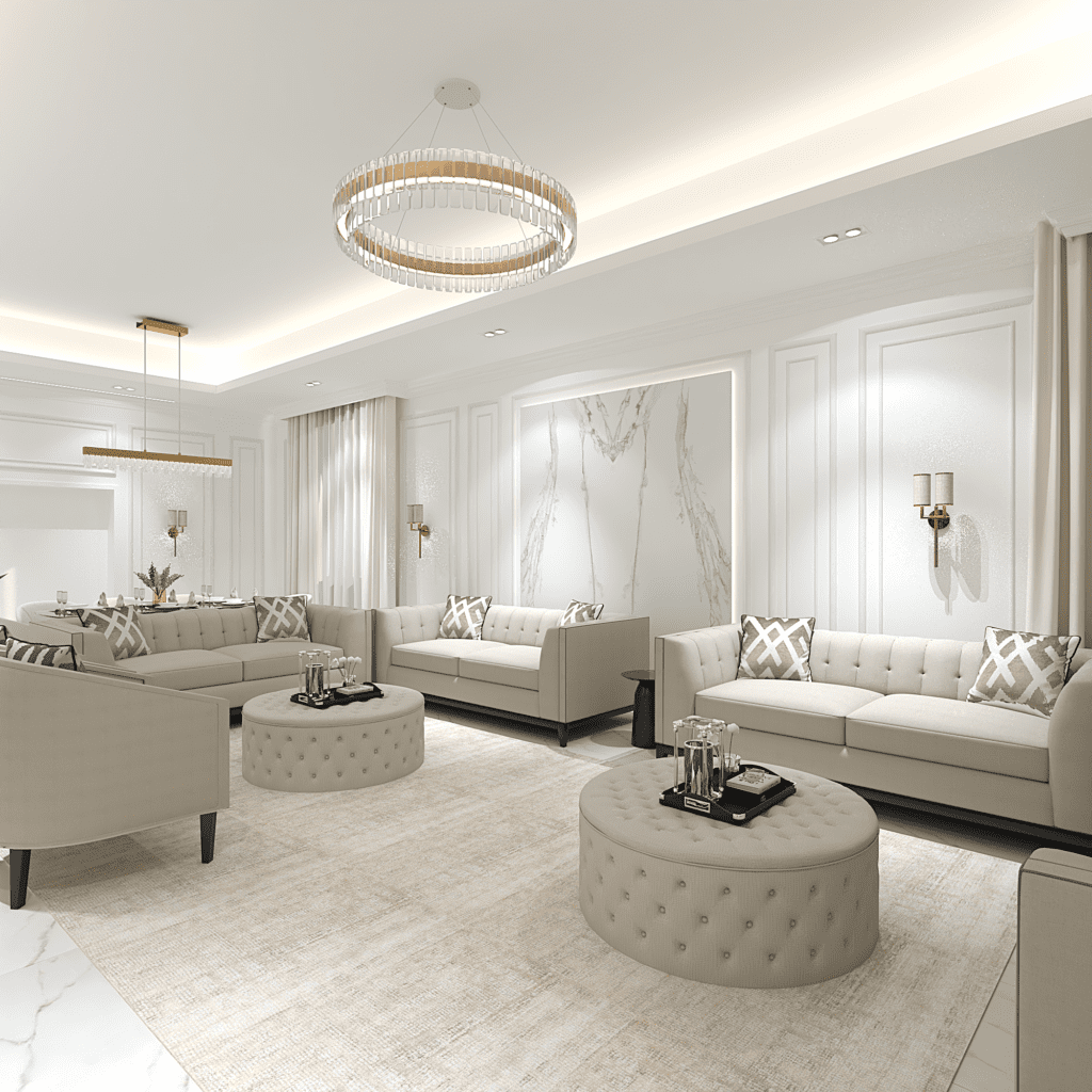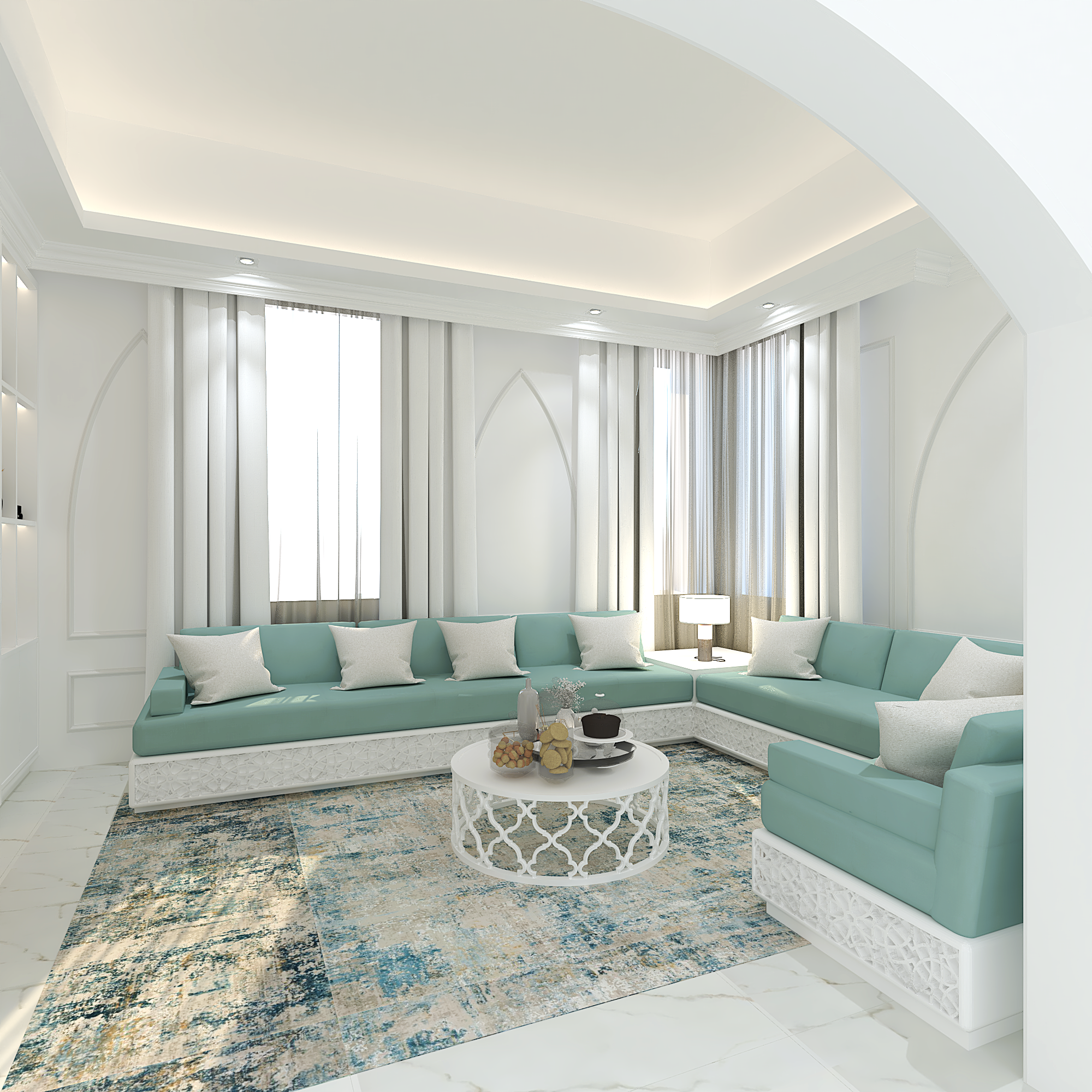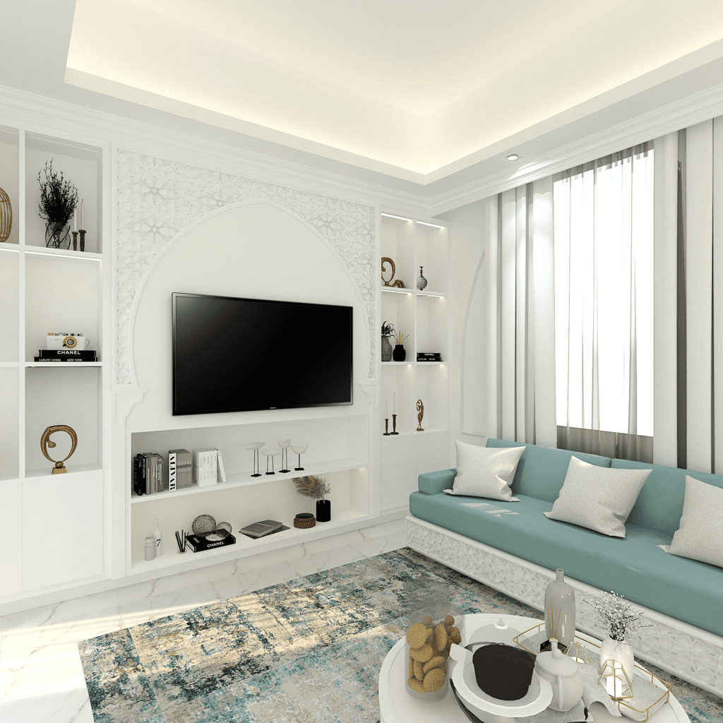 Design of a Women’s Majlis inspired by a classic style, blended with Moroccan patterns that add a distinctive touch to the overall aesthetic.