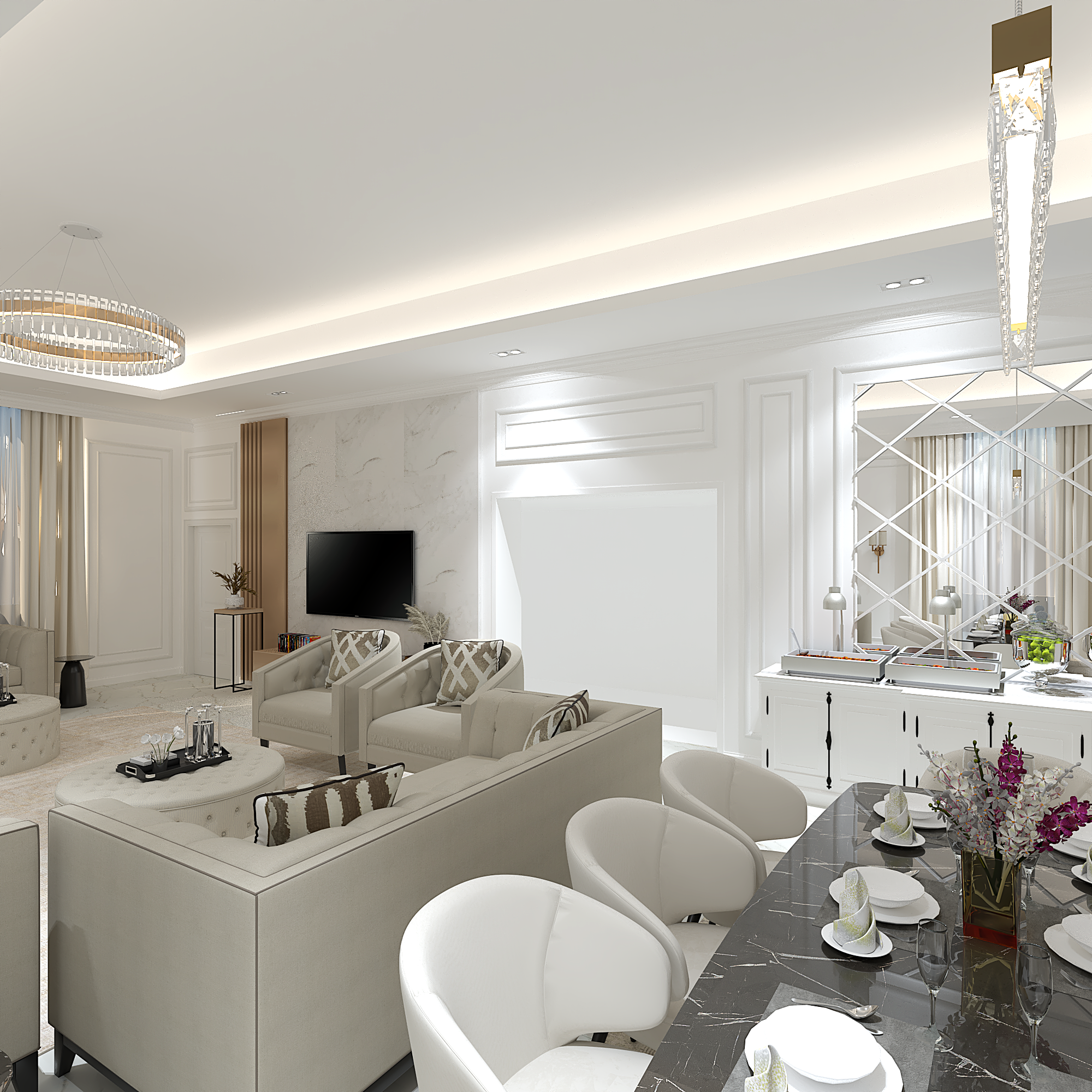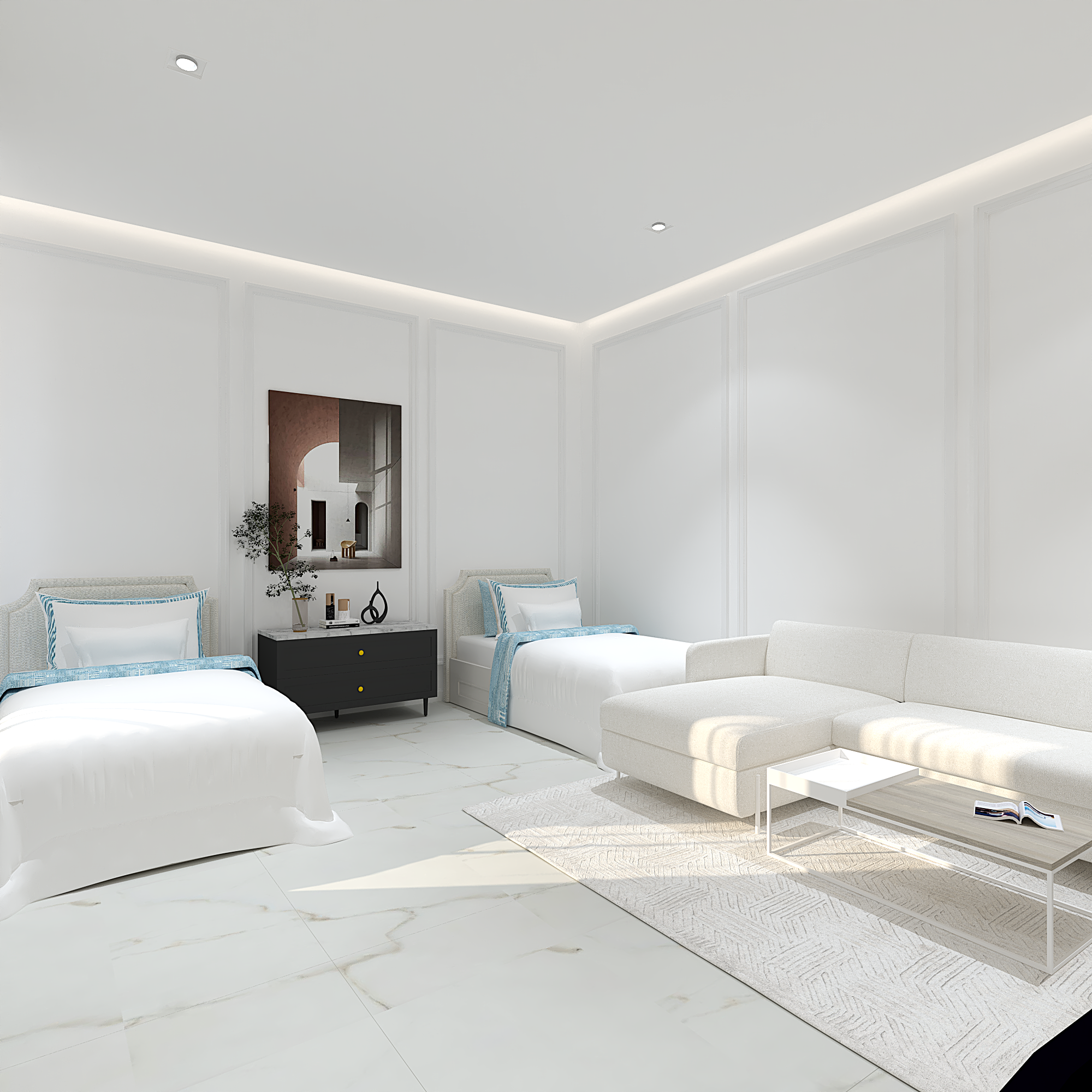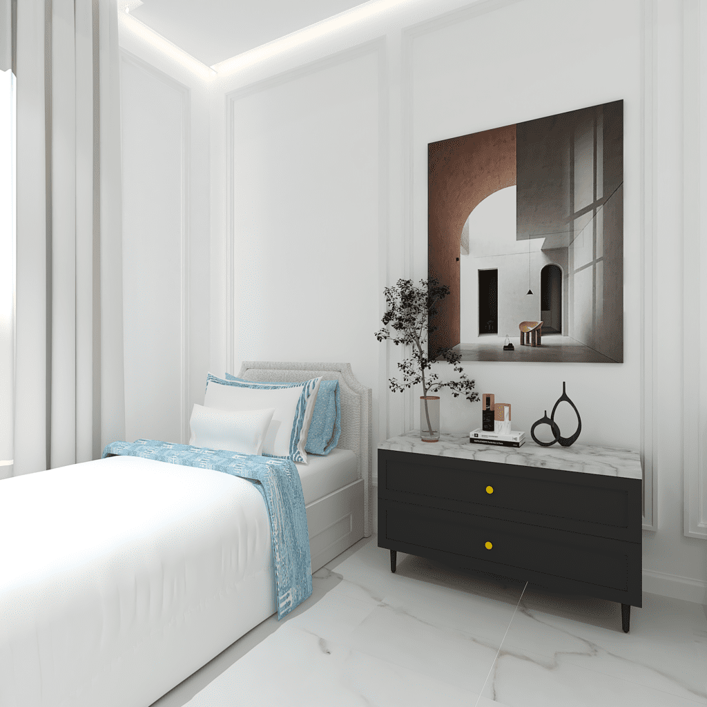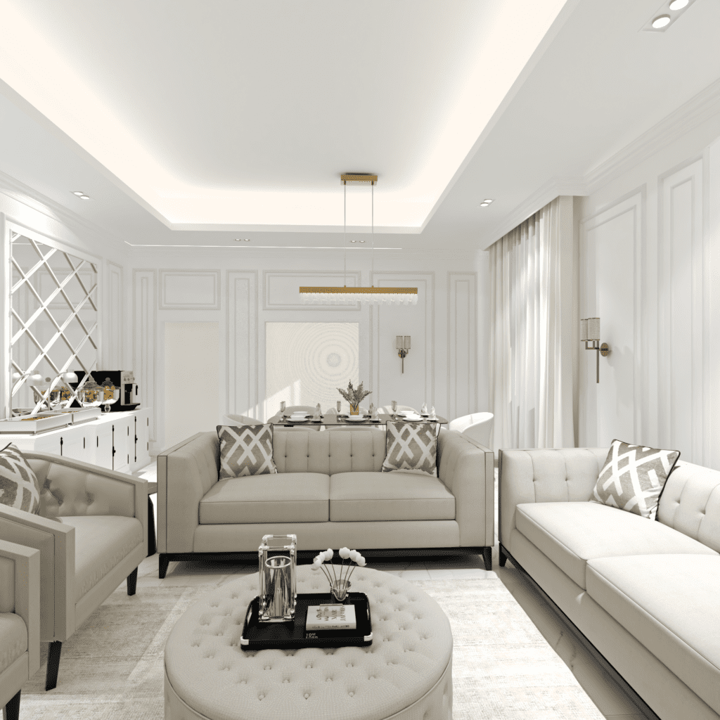 We translated this vision through the design by incorporating simple classic frames throughout the villa, with white as the main color, creating a sense of comfort and openness in the space and design.